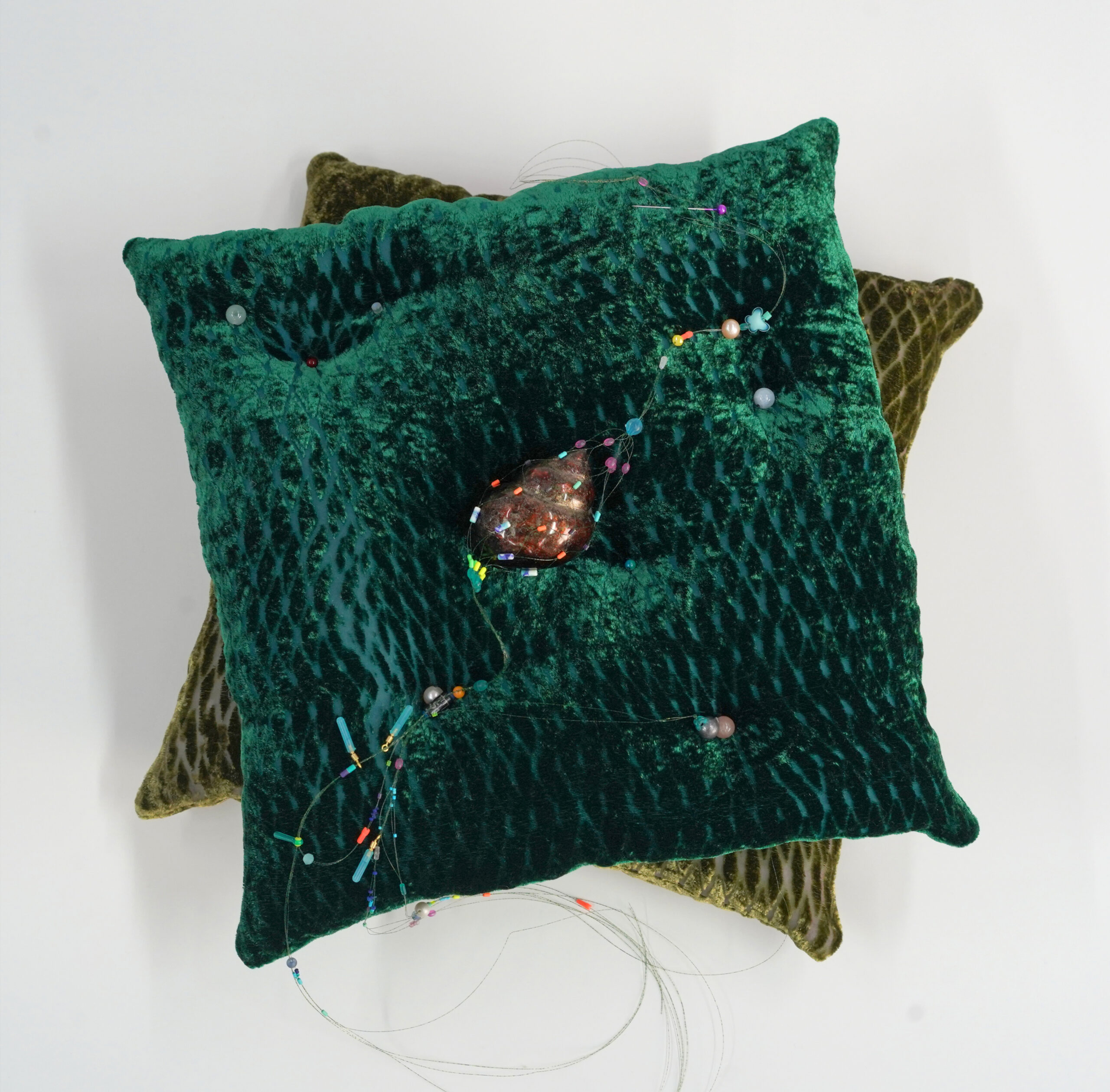 Seven Nets Chai 本展のタイトル「七重網舞」より着想し、7種のスパイスを使用したチャイをご用意しました。 グリーンカルダモン、クローブ、黒胡椒、クミンシード、生姜、サフラン。サロメが纏う七重のベールが抱く多層なイメージのように、複雑な味わいが広がります。 Velvet Depths Green tea 「Velvet Depths」が持つ深いグリーンとベルベットの質感からインスパイアされたグリーンティー。 農村で育った記憶から生み出される陳俐の作品のエッセンスを投影して、ライムとミントの爽やかな風味を添えました。